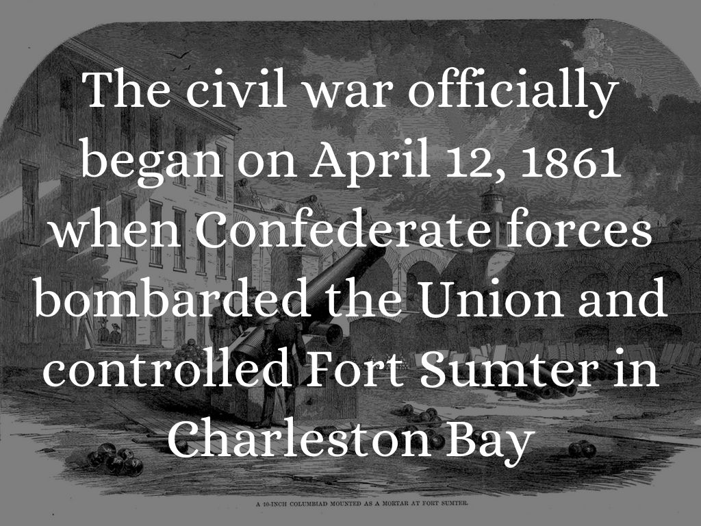 The civil war officially began on April 12, 1861 when Confederate forces bombarded the Union and controlled Fort Sumter in Charleston Bay