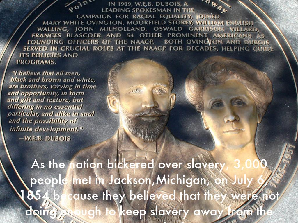 As the nation bickered over slavery, 3,000 people met in Jackson,Michigan, on July 6, 1854 because they believed that they were not doing enough to keep slavery away from the western territories.