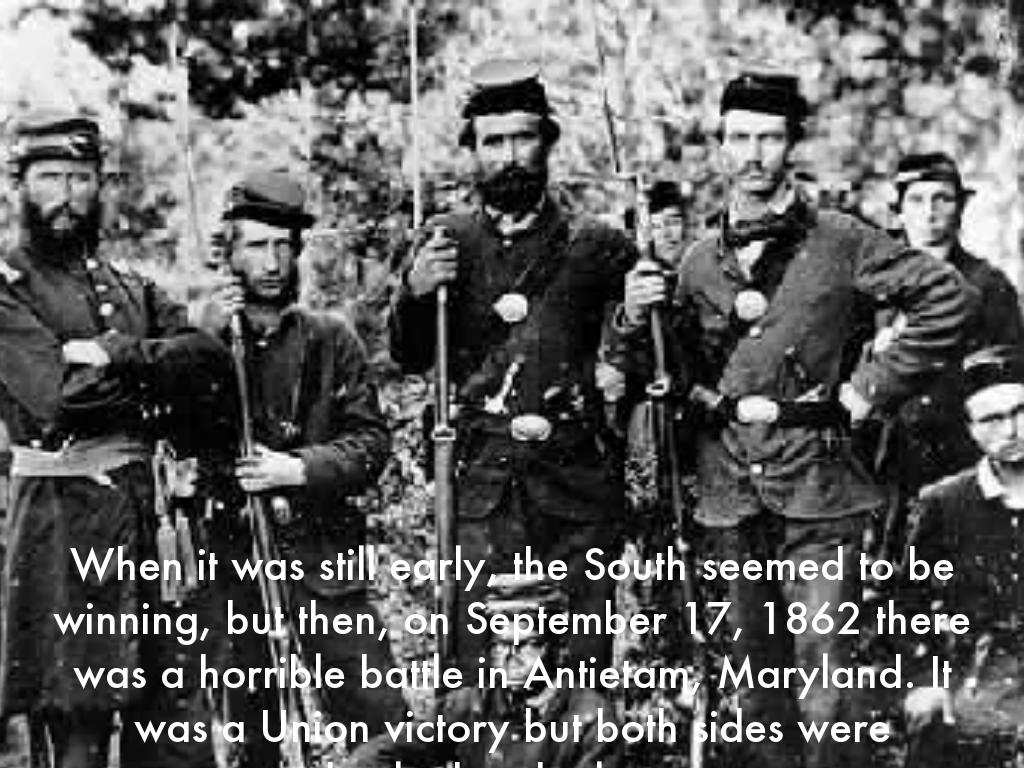 When it was still early, the South seemed to be winning, but then, on September 17, 1862 there was a horrible battle in Antietam, Maryland. It was a Union victory but both sides were shocked at the losses.