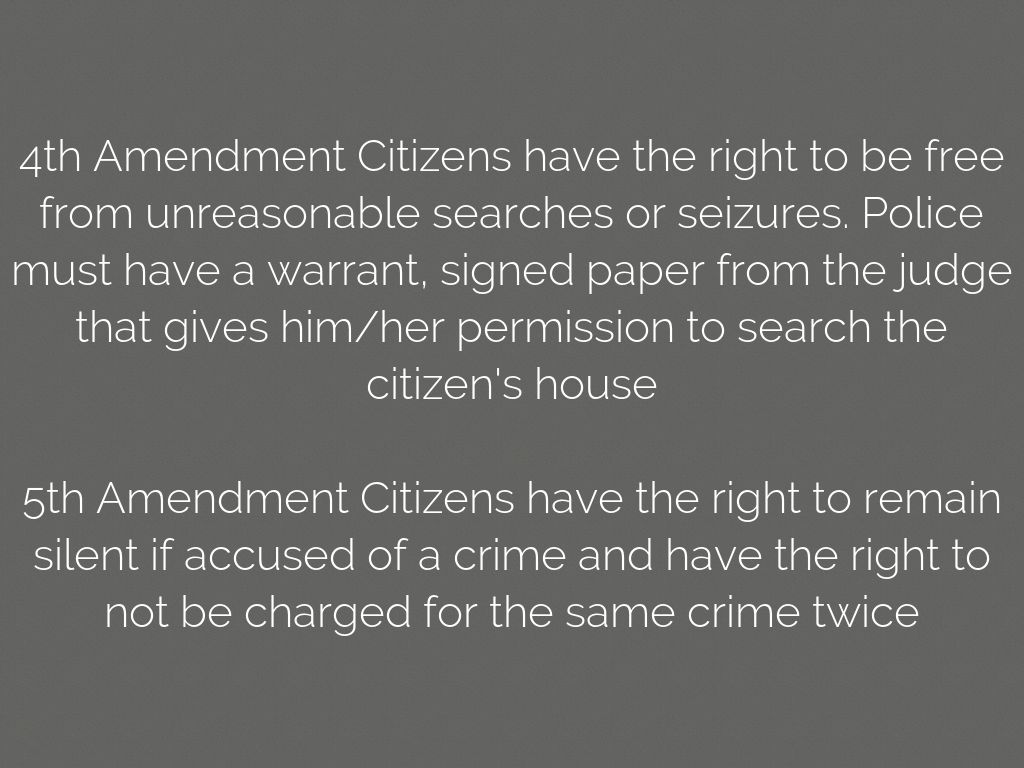 4th Amendment Citizens have the right to be free from unreasonable searches or seizures. Police must have a warrant, signed paper from the judge that gives him/her permission to search the citizen's house