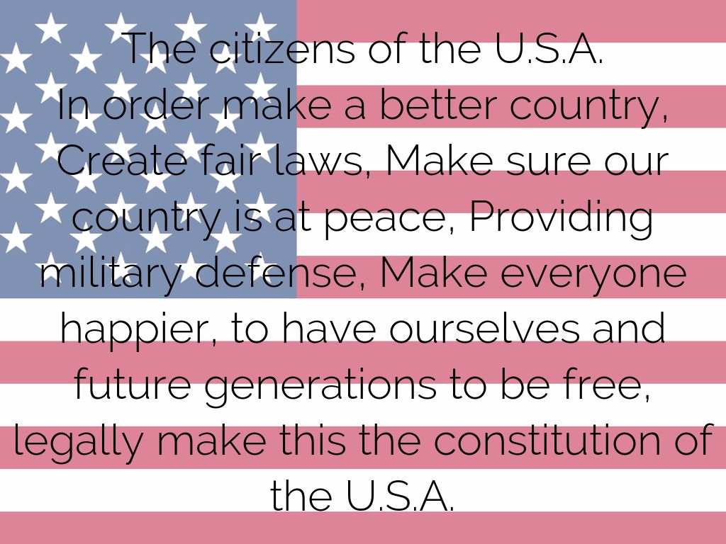 Create fair laws, Make sure our country is at peace, Providing military defense, Make everyone happier, to have ourselves and future generations to be free, legally make this the constitution of the U.S.A.