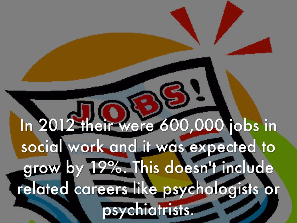 In 2012 their were 600,000 jobs in social work and it was expected to grow by 19%. This doesn't include related careers like psychologists or psychiatrists.
