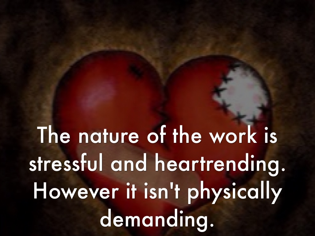 The nature of the work is stressful and heartrending. However it isn't physically demanding.