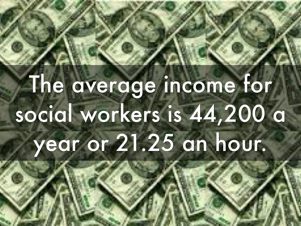 The average income for social workers is 44,200 a year or 21.25 an hour.