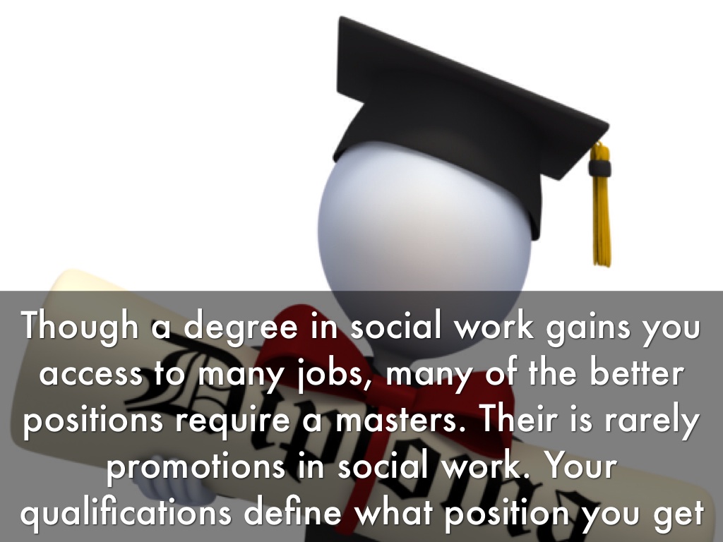Though a degree in social work gains you access to many jobs, many of the better positions require a masters. Their is rarely promotions in social work. Your qualifications define what position you get