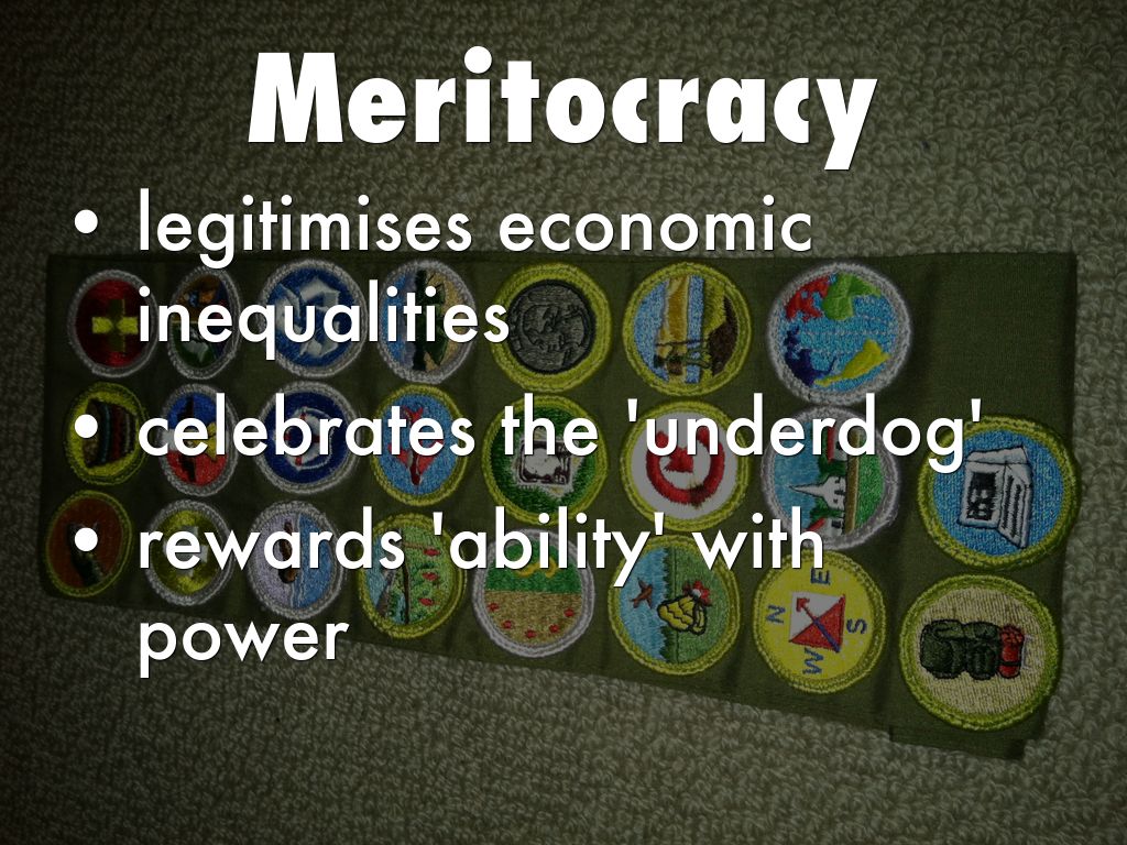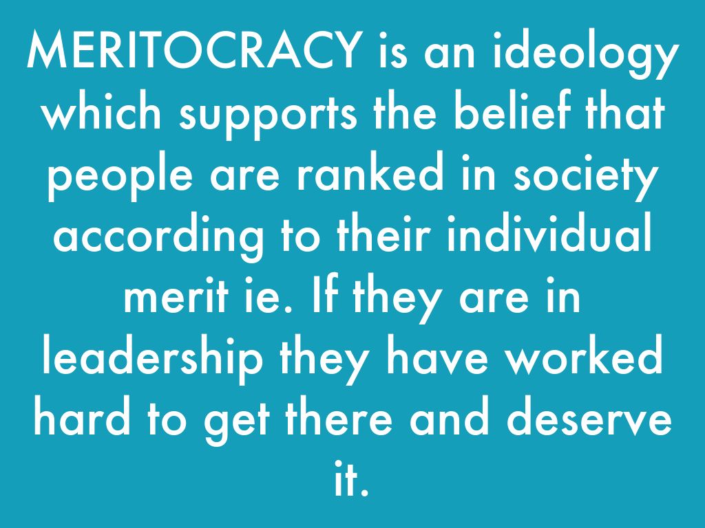 MERITOCRACY is an ideology which supports the belief that people are ranked in society according to their individual merit ie. If they are in leadership they have worked hard to get there and deserve it.