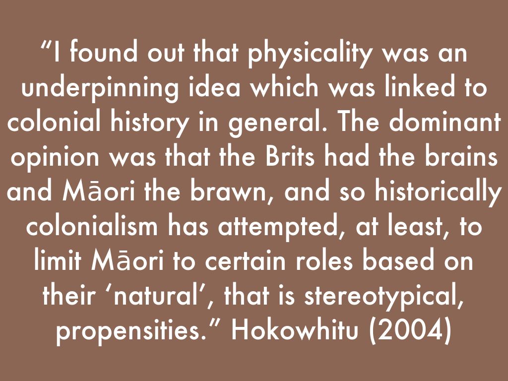 “I found out that physicality was an underpinning idea which was linked to colonial history in general. The dominant opinion was that the Brits had the brains and Māori the brawn, and so historically colonialism has attempted, at least, to limit Māori to certain roles based on their ‘natural’, that is stereotypical, propensities.” Hokowhitu (2004)