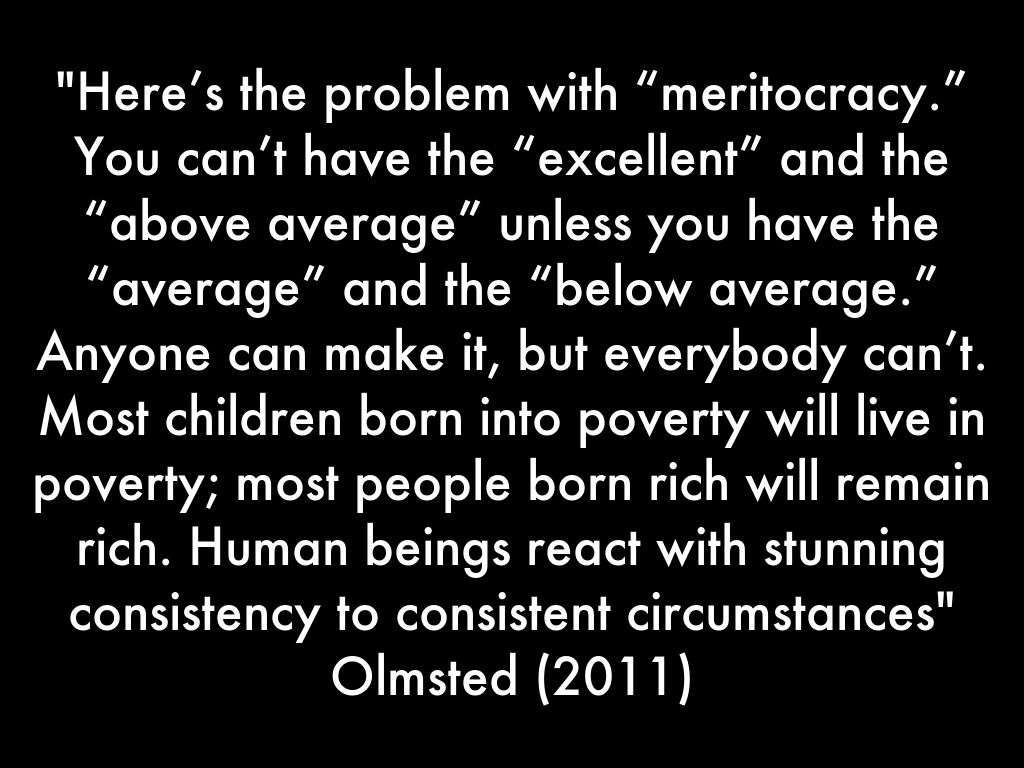 "Here’s the problem with “meritocracy.” You can’t have the “excellent” and the “above average” unless you have the “average” and the “below average.” Anyone can make it, but everybody can’t. Most children born into poverty will live in poverty; most people born rich will remain rich. Human beings react with stunning consistency to consistent circumstances" Olmsted (2011)