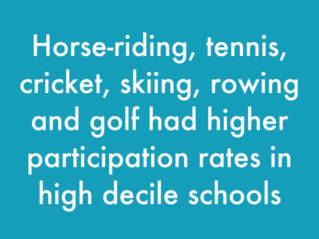 Horse-riding, tennis, cricket, skiing, rowing and golf had higher participation rates in high decile schools