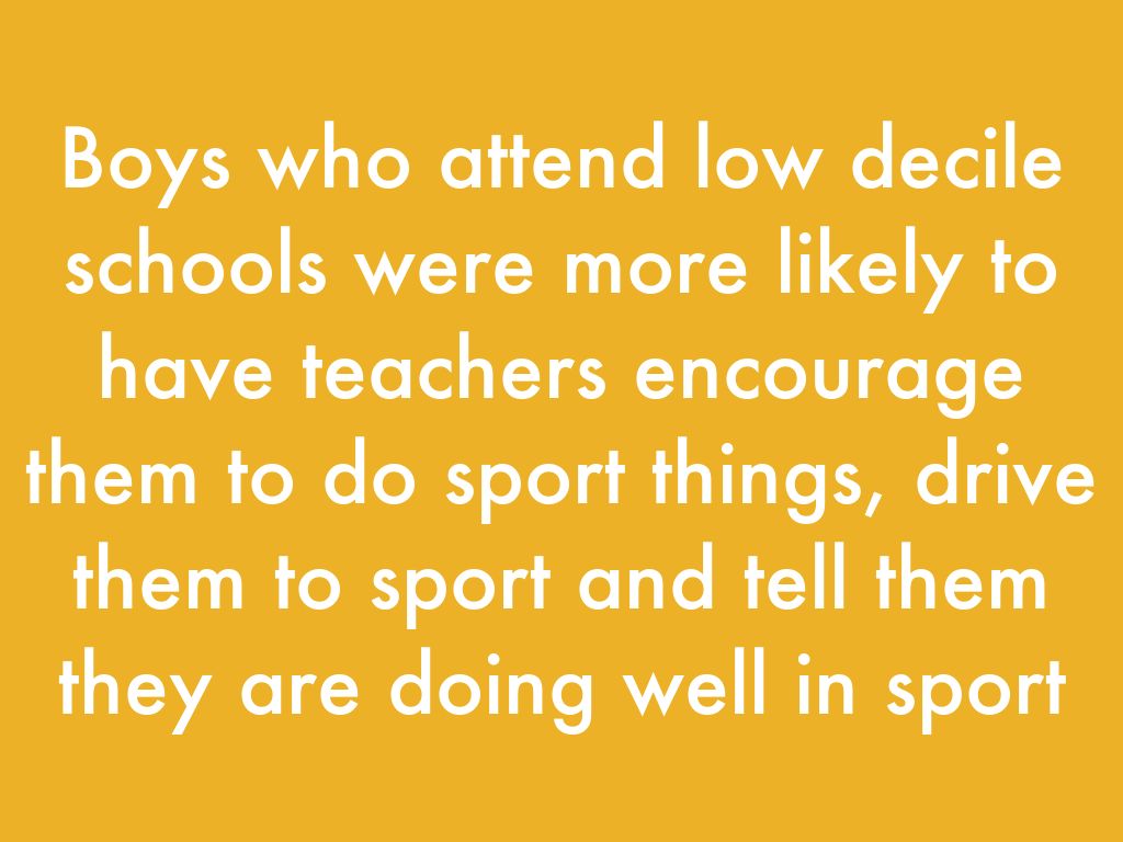 Boys who attend low decile schools were more likely to have teachers encourage them to do sport things, drive them to sport and tell them they are doing well in sport