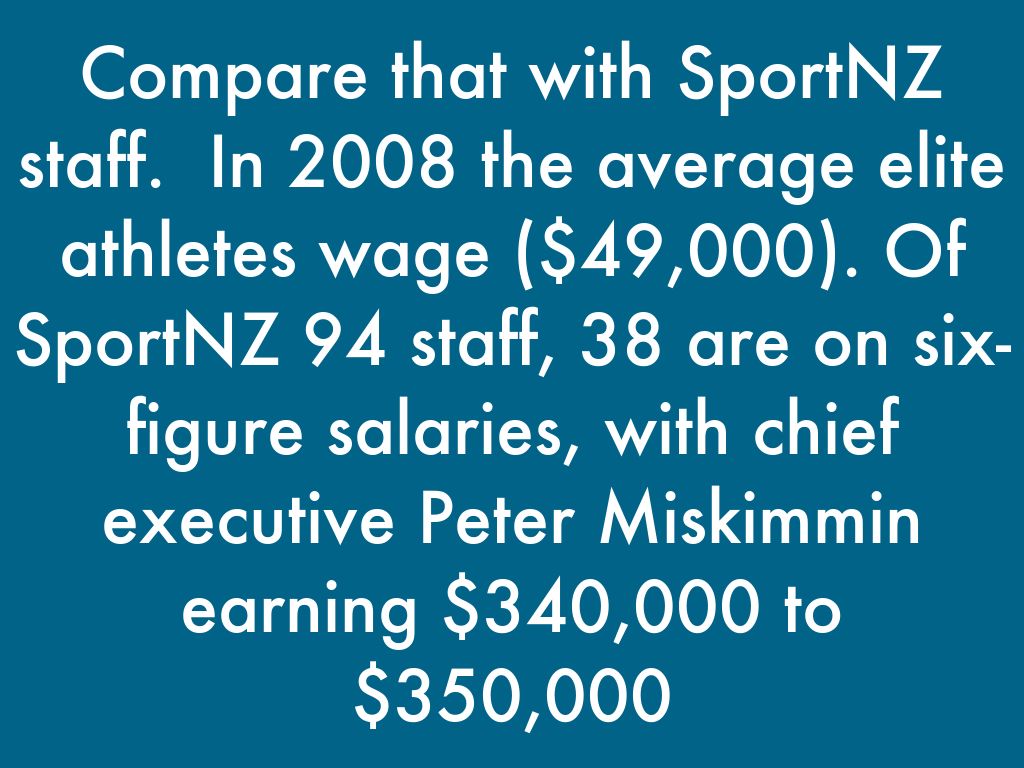Compare that with SportNZ staff. In 2008 the average elite athletes wage ($49,000). Of SportNZ 94 staff, 38 are on six-figure salaries, with chief executive Peter Miskimmin earning $340,000 to $350,000