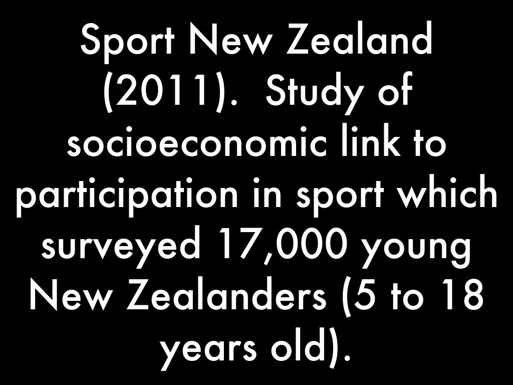 Sport New Zealand (2011). Study of socioeconomic link to participation in sport which surveyed 17,000 young New Zealanders (5 to 18 years old).