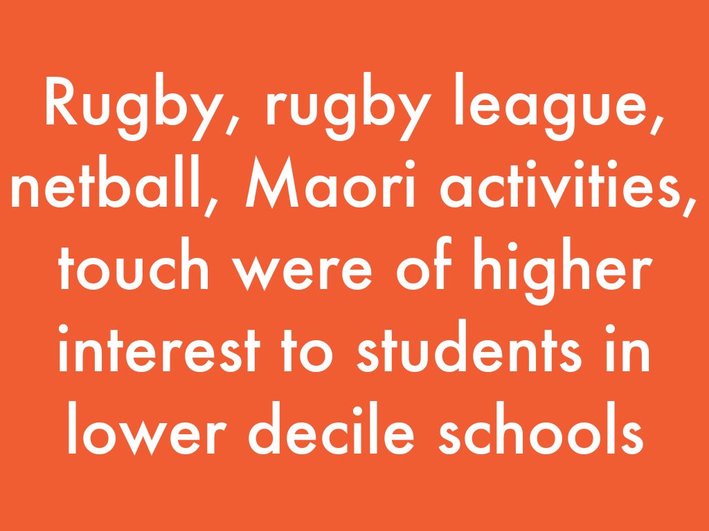 Rugby, rugby league, netball, Maori activities, touch were of higher interest to students in lower decile schools