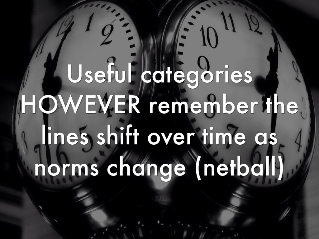 Useful categories HOWEVER remember the lines shift over time as norms change (netball)