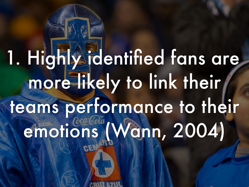 1. Highly identified fans are more likely to link their teams performance to their emotions (Wann, 2004)