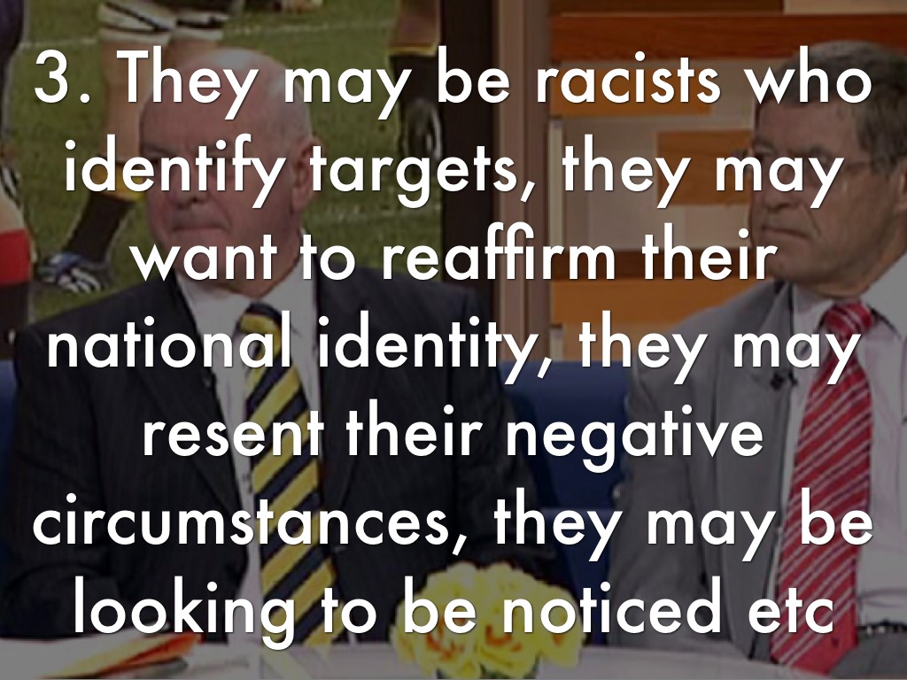 3. They may be racists who identify targets, they may want to reaffirm their national identity, they may resent their negative circumstances, they may be looking to be noticed etc