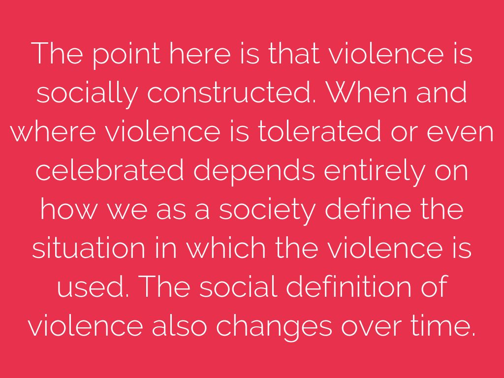 The point here is that violence is socially constructed. When and where violence is tolerated or even celebrated depends entirely on how we as a society define the situation in which the violence is used. The social definition of violence also changes over time.