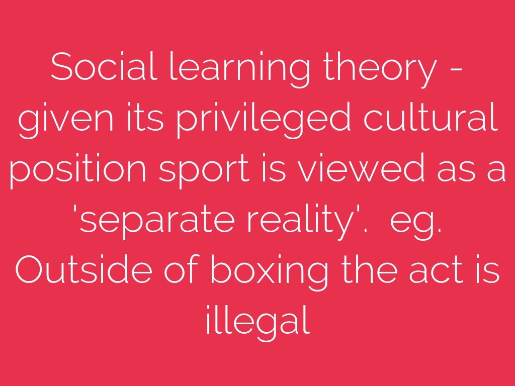 Social learning theory - given its privileged cultural position sport is viewed as a 'separate reality'. eg. Outside of boxing the act is illegal