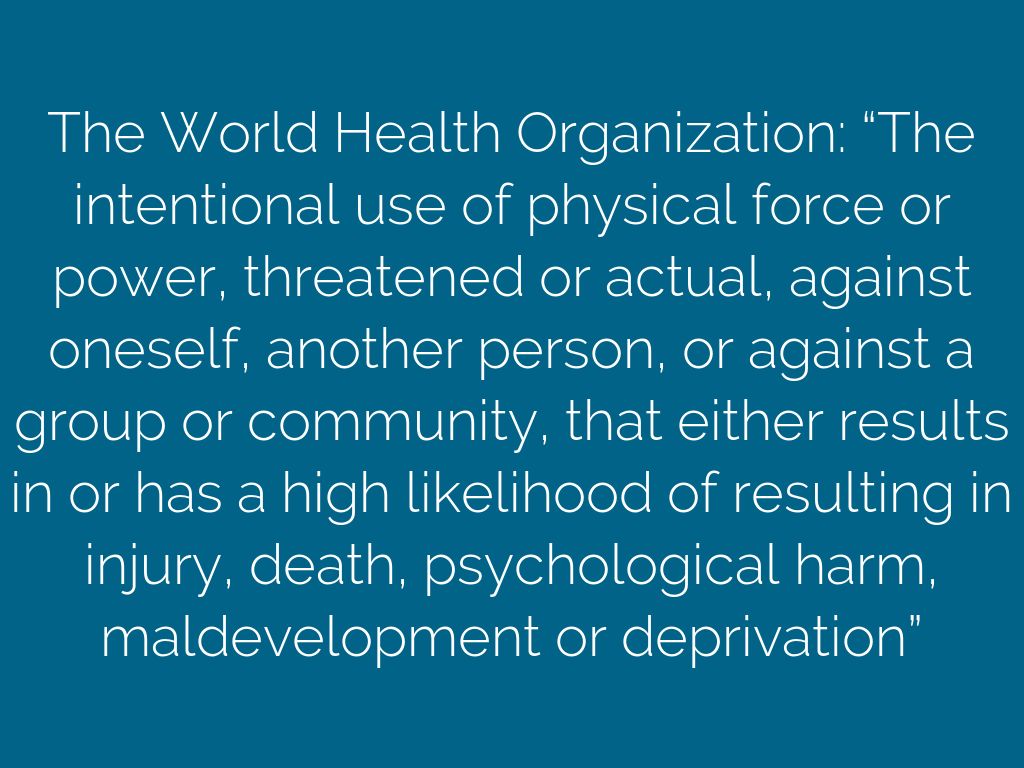 The World Health Organization: “The intentional use of physical force or power, threatened or actual, against oneself, another person, or against a group or community, that either results in or has a high likelihood of resulting in injury, death, psychological harm, maldevelopment or deprivation”