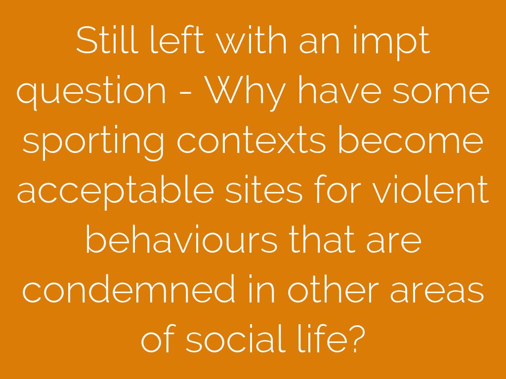 Still left with an impt question - Why have some sporting contexts become acceptable sites for violent behaviours that are condemned in other areas of social life?