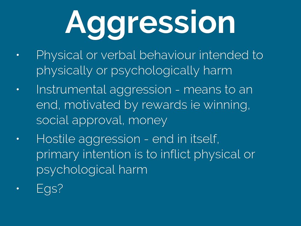 - Hostile aggression - end in itself, primary intention is to inflict physical or psychological harm