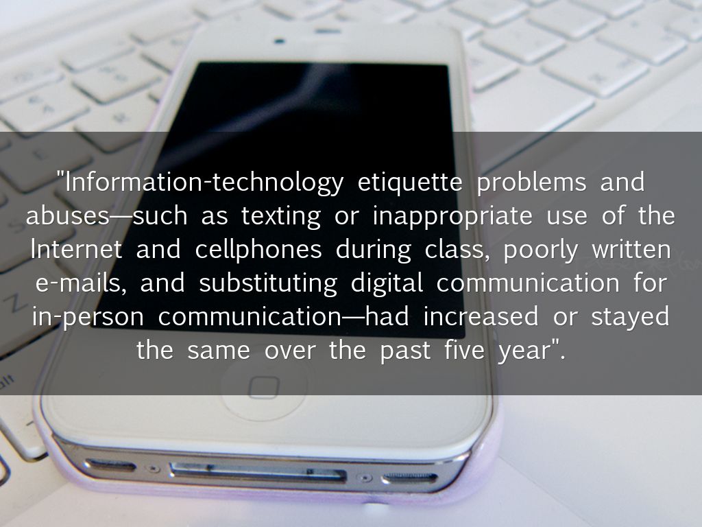 "Information-technology etiquette problems and abuses—such as texting or inappropriate use of the Internet and cellphones during class, poorly written e-mails, and substituting digital communication for in-person communication—had increased or stayed the same over the past five year".