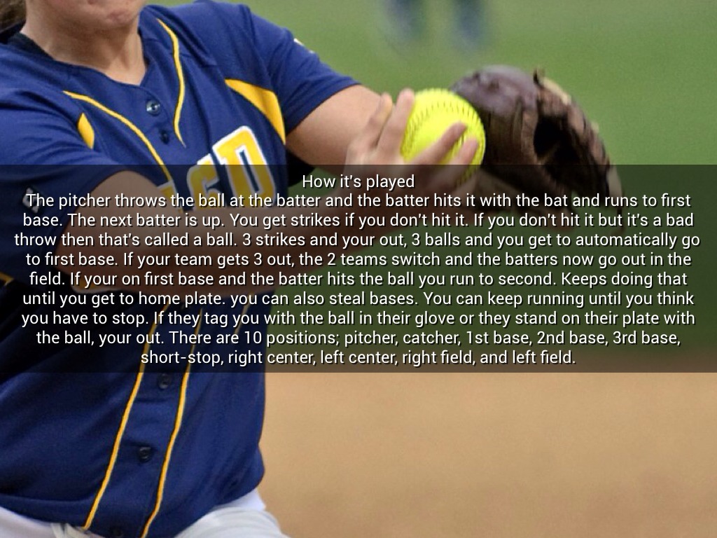 How it's played The pitcher throws the ball at the batter and the batter hits it with the bat and runs to first base. The next batter is up. You get strikes if you don't hit it. If you don't hit it but it's a bad throw then that's called a ball. 3 strikes and your out, 3 balls and you get to automatically go to first base. If your team gets 3 out, the 2 teams switch and the batters now go out in the field. If your on first base and the batter hits the ball you run to second. Keeps doing that until you get to home plate. you can also steal bases. You can keep running until you think you have to stop. If they tag you with the ball in their glove or they stand on their plate with the ball, your out. There are 10 positions; pitcher, catcher, 1st base, 2nd base, 3rd base, short-stop, right center, left center, right field, and left field.