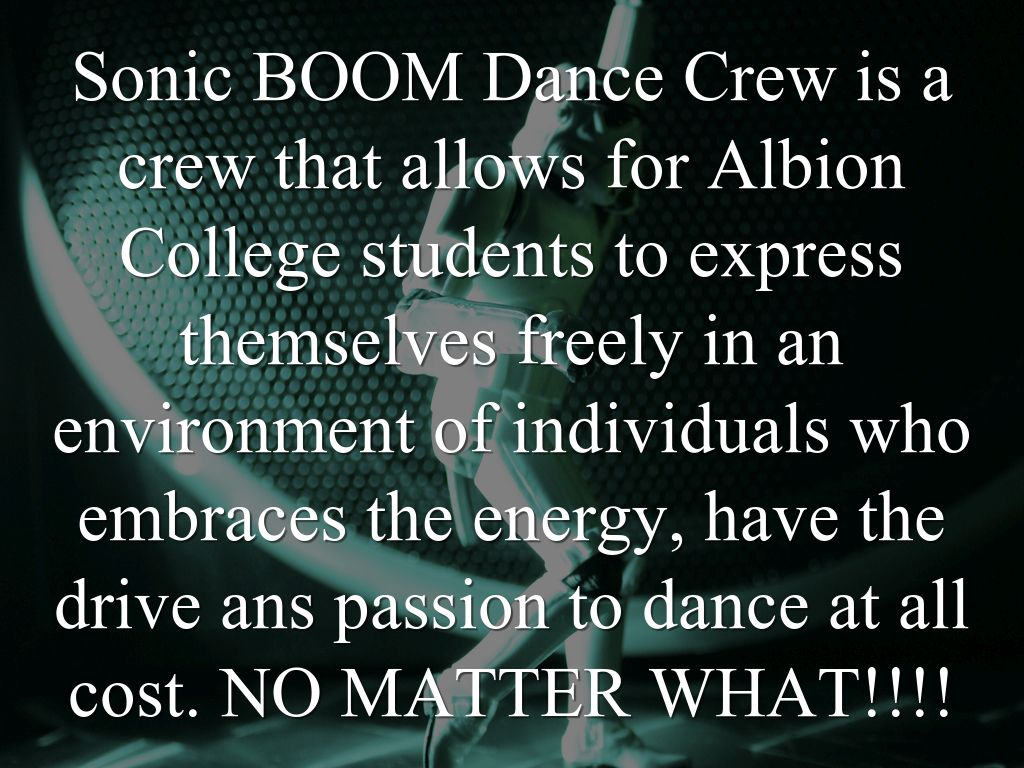 Sonic BOOM Dance Crew is a crew that allows for Albion College students to express themselves freely in an environment of individuals who embraces the energy, have the drive ans passion to dance at all cost. NO MATTER WHAT!!!!