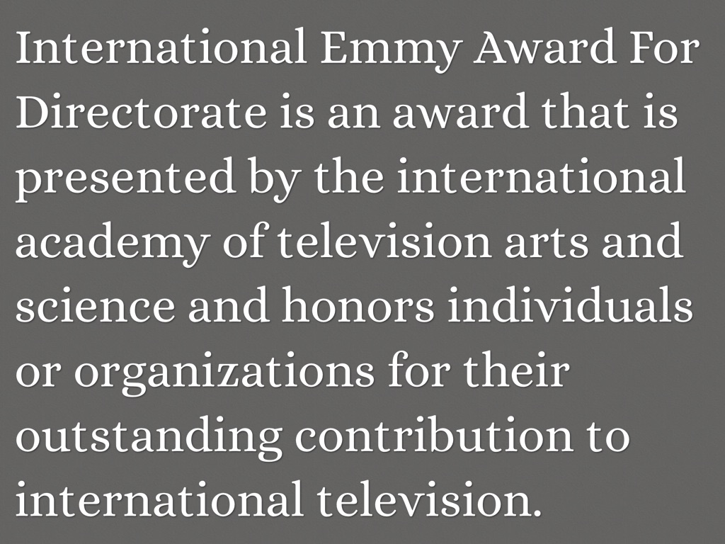 International Emmy Award For Directorate is an award that is presented by the international academy of television arts and science and honors individuals or organizations for their outstanding contribution to international television.