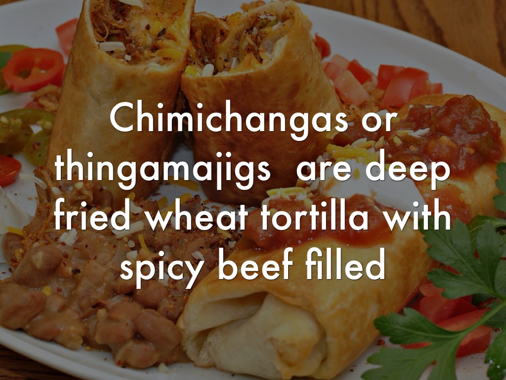 Chimichangas or thingamajigs are deep fried wheat tortilla with spicy beef filled