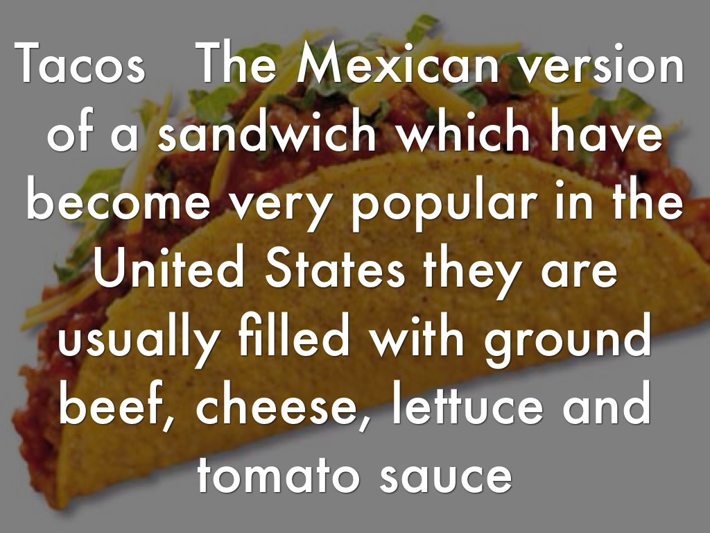 Tacos The Mexican version of a sandwich which have become very popular in the United States they are usually filled with ground beef, cheese, lettuce and tomato sauce