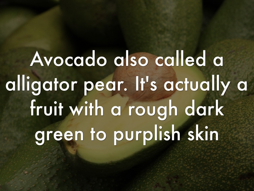 Avocado also called a alligator pear. It's actually a fruit with a rough dark green to purplish skin