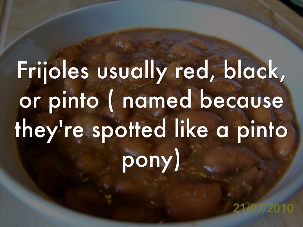 Frijoles usually red, black, or pinto ( named because they're spotted like a pinto pony)