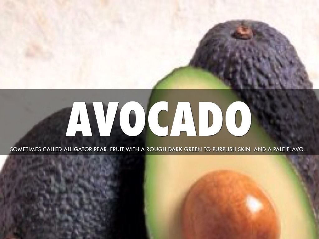 SOMETIMES CALLED ALLIGATOR PEAR. FRUIT WITH A ROUGH DARK GREEN TO PURPLISH SKIN AND A PALE FLAVORED FLESH.