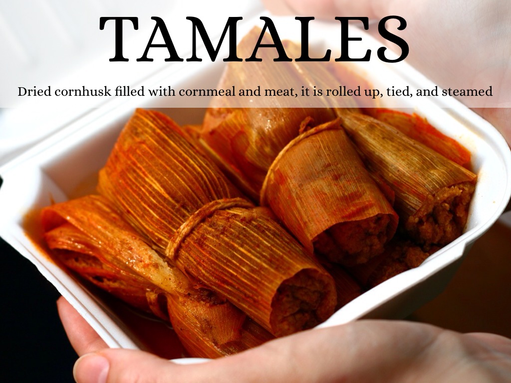 Dried cornhusk filled with cornmeal and meat, it is rolled up, tied, and steamed
