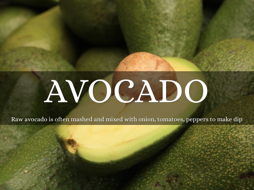 Raw avocado is often mashed and mixed with onion, tomatoes, peppers to make dip