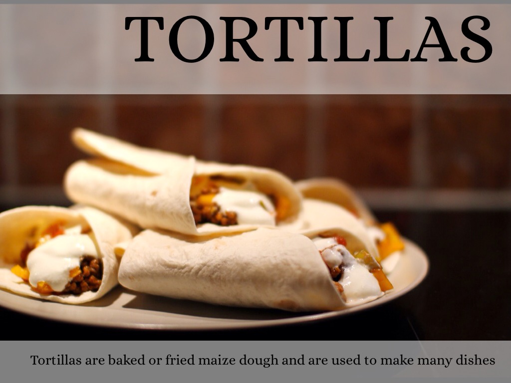 Tortillas are baked or fried maize dough and are used to make many dishes