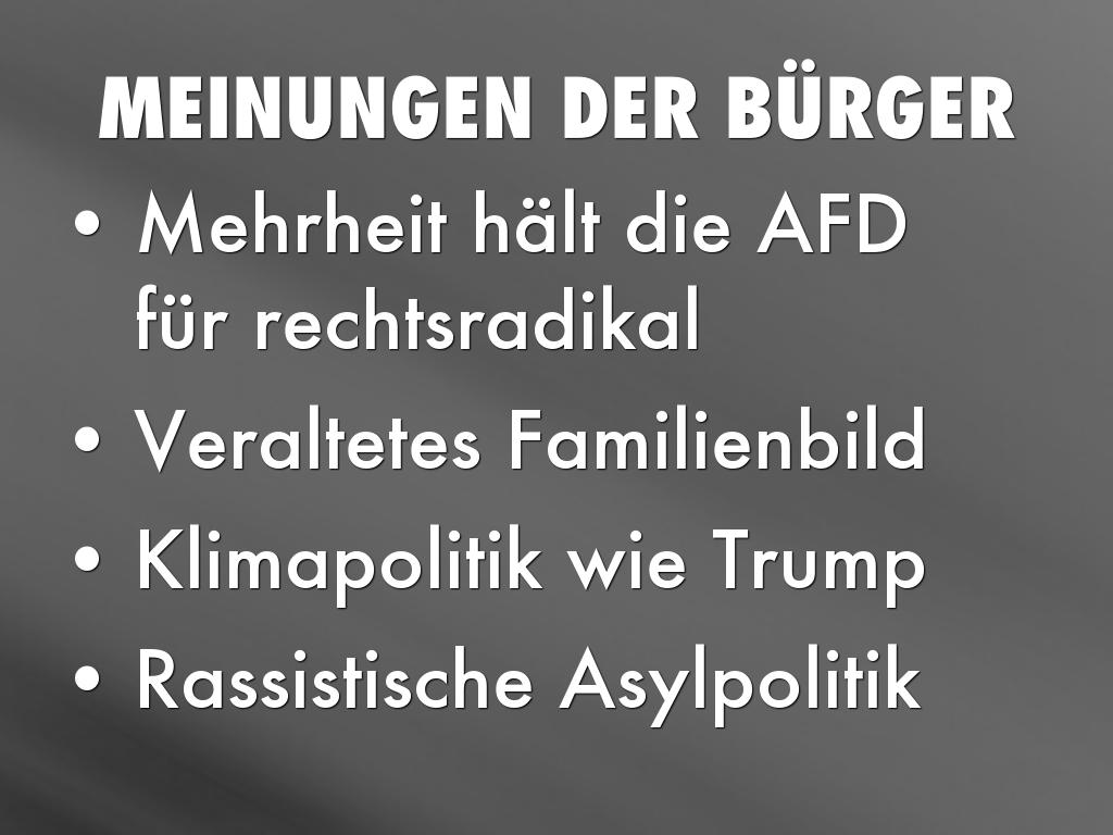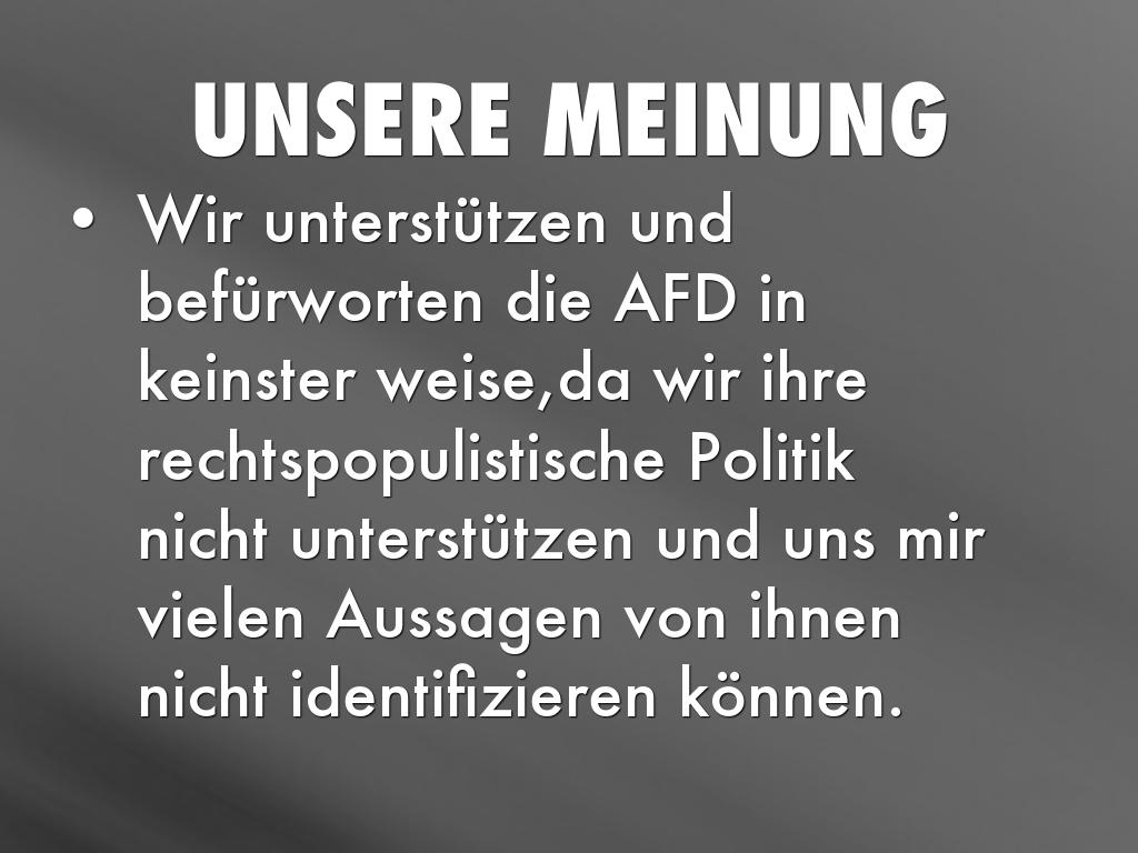 Wir unterstützen und befürworten die AFD in keinster weise,da wir ihre rechtspopulistische Politik nicht unterstützen und uns mir vielen Aussagen von ihnen nicht identifizieren können.