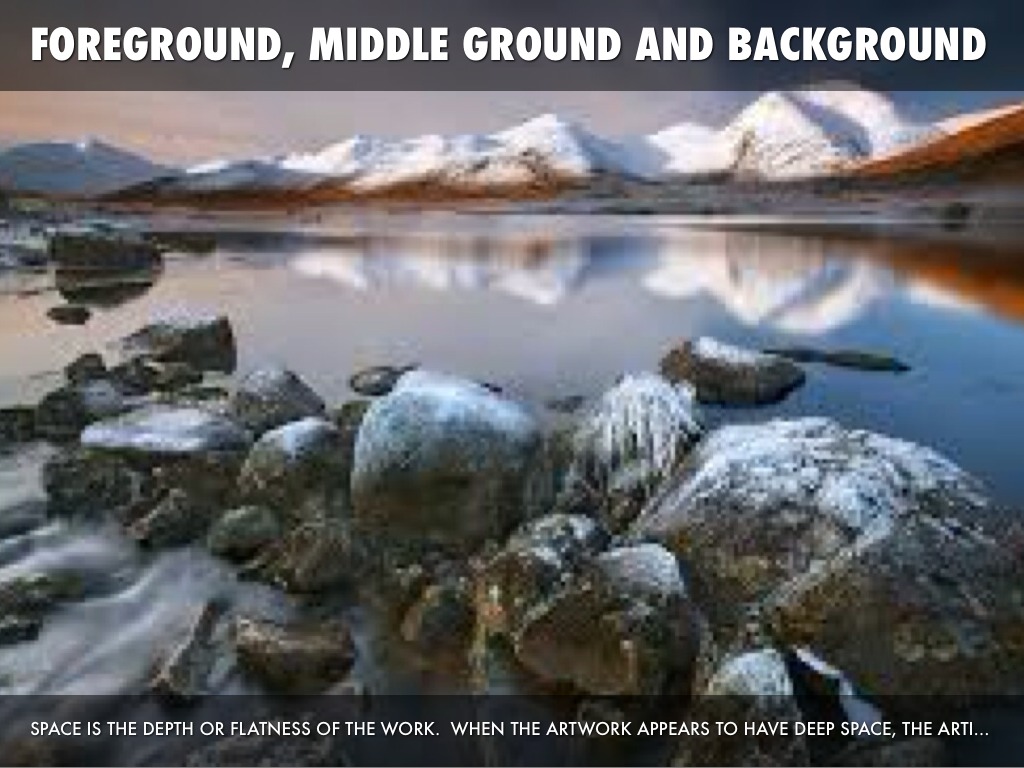 SPACE IS THE DEPTH OR FLATNESS OF THE WORK. WHEN THE ARTWORK APPEARS TO HAVE DEEP SPACE, THE ARTIST OFTEN PLACES OBJECTS CLOSE, FAR AND IN BETWEEN.