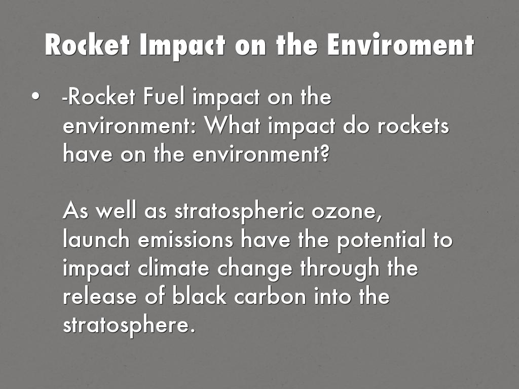 • -Rocket Fuel impact on the environment: What impact do rockets have on the environment? As well as stratospheric ozone, launch emissions have the potential to impact climate change through the release of black carbon into the stratosphere.