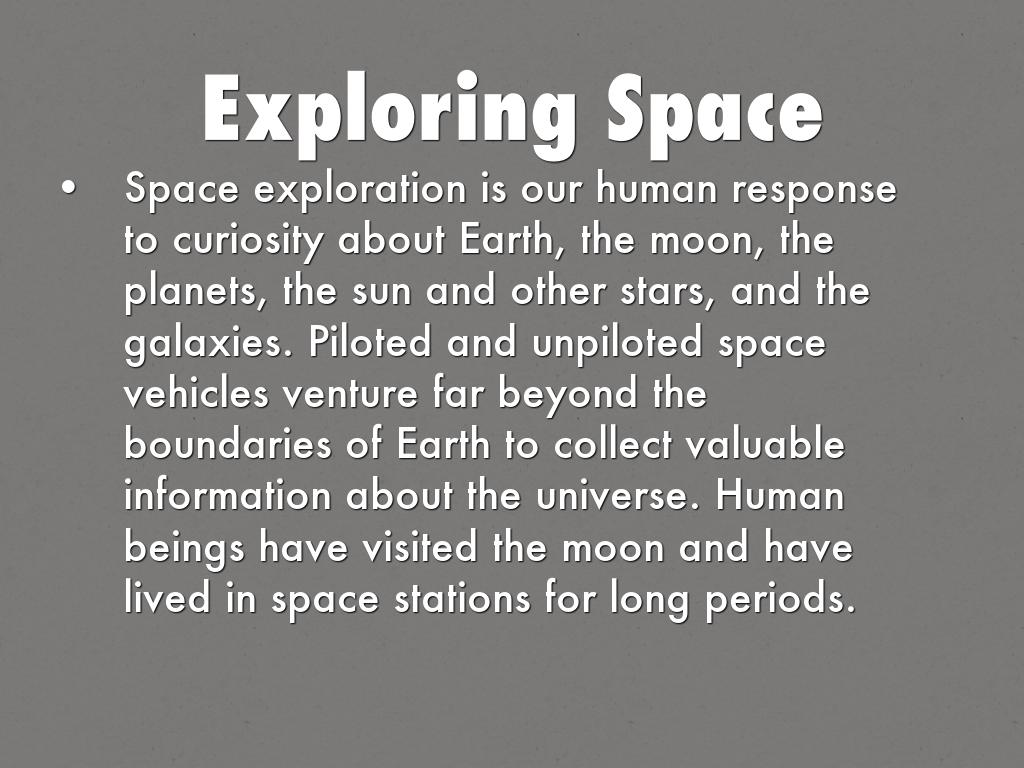• Space exploration is our human response to curiosity about Earth, the moon, the planets, the sun and other stars, and the galaxies. Piloted and unpiloted space vehicles venture far beyond the boundaries of Earth to collect valuable information about the universe. Human beings have visited the moon and have lived in space stations for long periods.