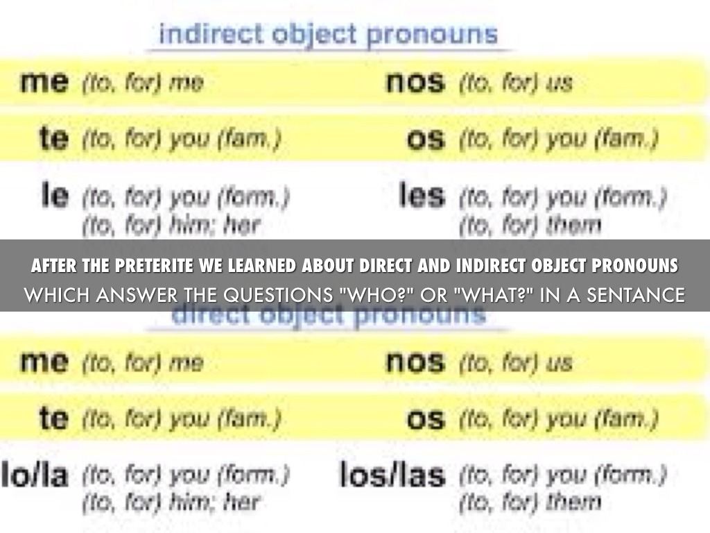 AFTER THE PRETERITE WE LEARNED ABOUT DIRECT AND INDIRECT OBJECT PRONOUNS