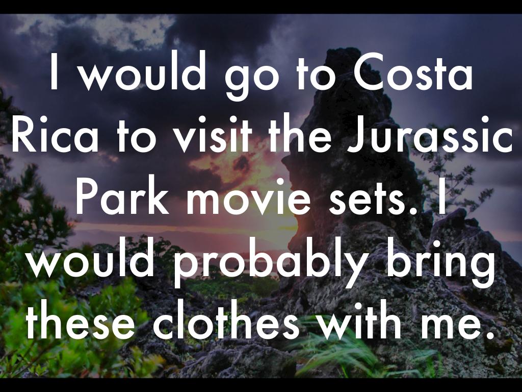 I would go to Costa Rica to visit the Jurassic Park movie sets. I would probably bring these clothes with me.