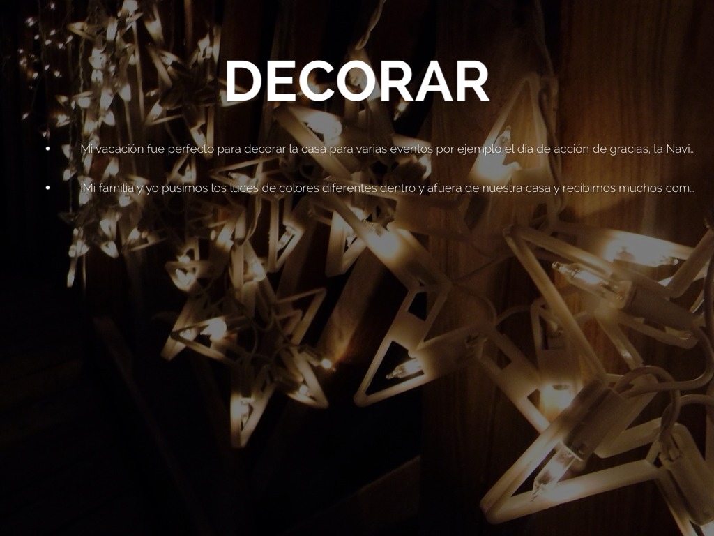 Mi vacación fue perfecto para decorar la casa para varias eventos por ejemplo el día de acción de gracias, la Navidad, y el año Nuevo.
