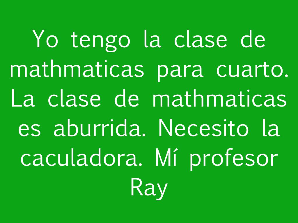 Yo tengo la clase de mathmaticas para cuarto. La clase de mathmaticas es aburrida. Necesito la caculadora. Mí profesor Ray