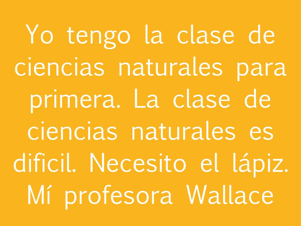 Yo tengo la clase de ciencias naturales para primera. La clase de ciencias naturales es dificil. Necesito el lápiz. Mí profesora Wallace
