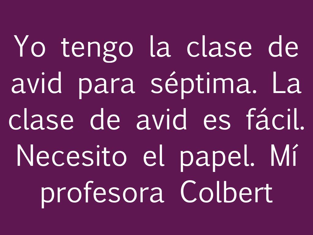 Yo tengo la clase de avid para séptima. La clase de avid es fácil. Necesito el papel. Mí profesora Colbert