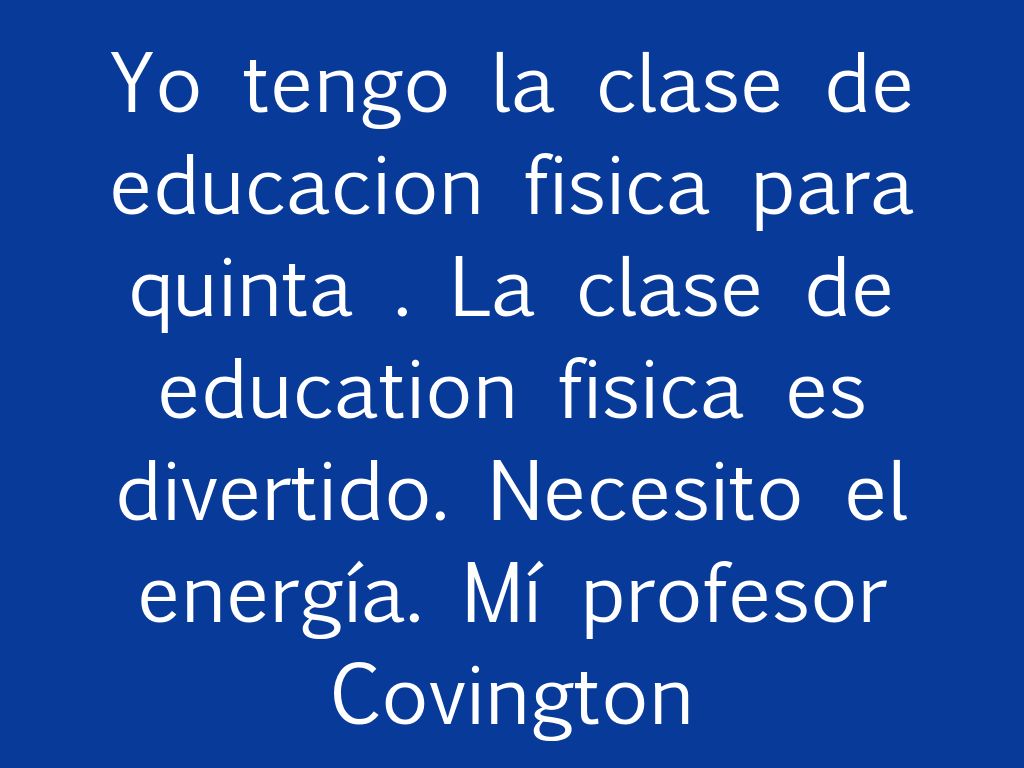 Yo tengo la clase de educacion fisica para quinta . La clase de education fisica es divertido. Necesito el energía. Mí profesor Covington