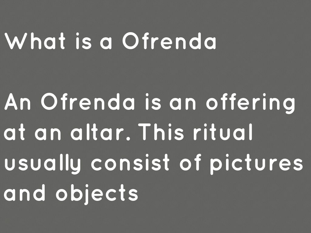 An Ofrenda is an offering at an altar. This ritual usually consist of pictures and objects