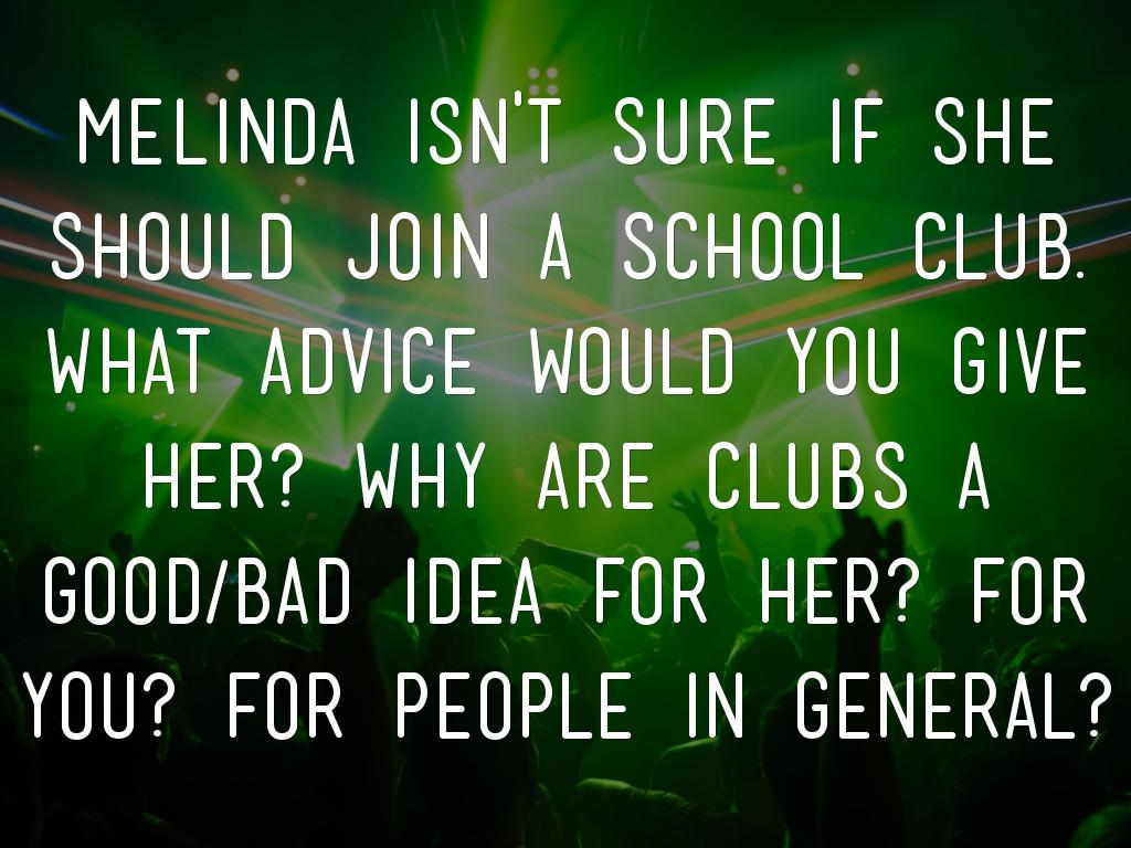 MELINDA isn't sure if she should join a school club. What advice would you give her? Why are clubs a good/bad idea for her? For you? For people in general?